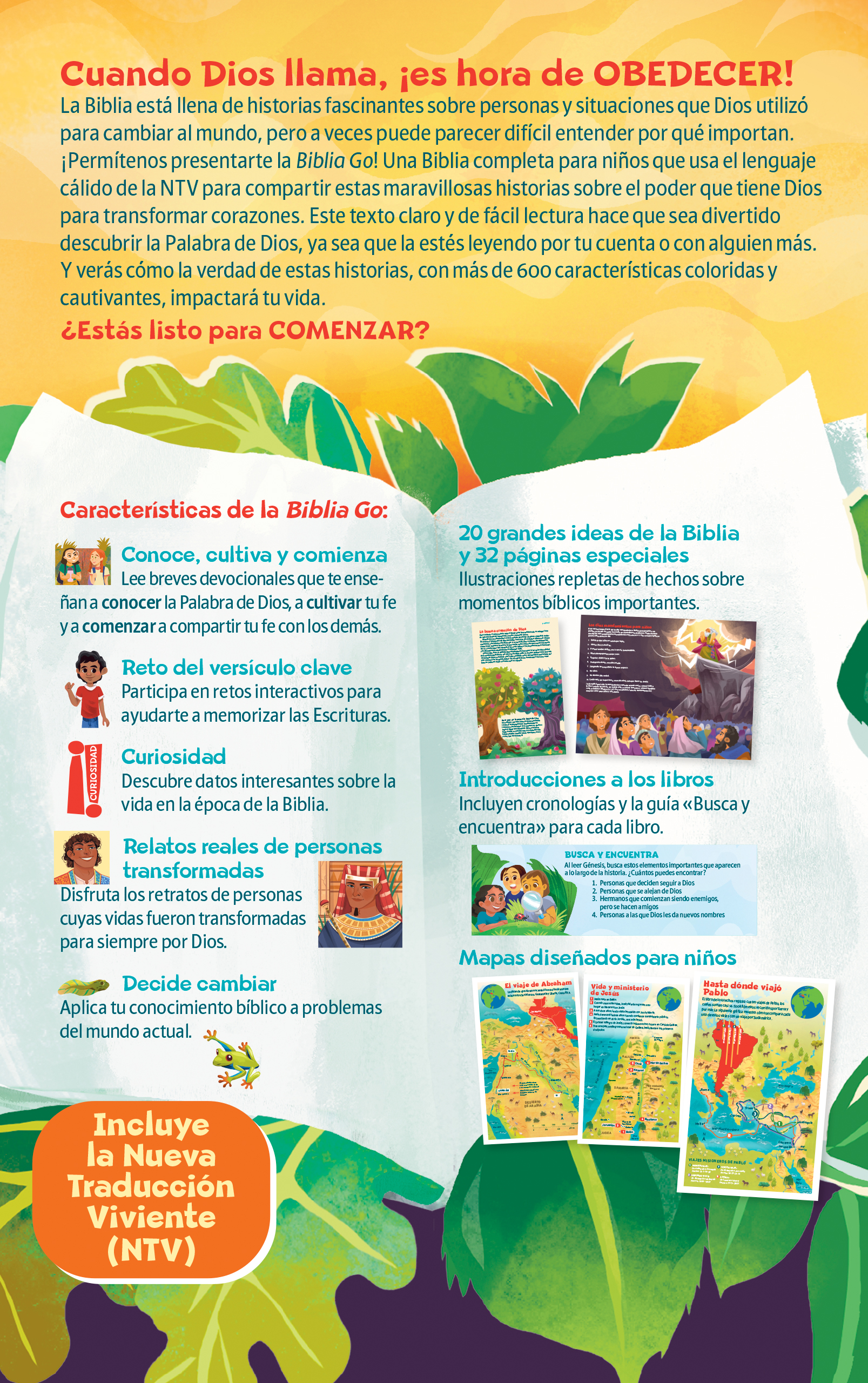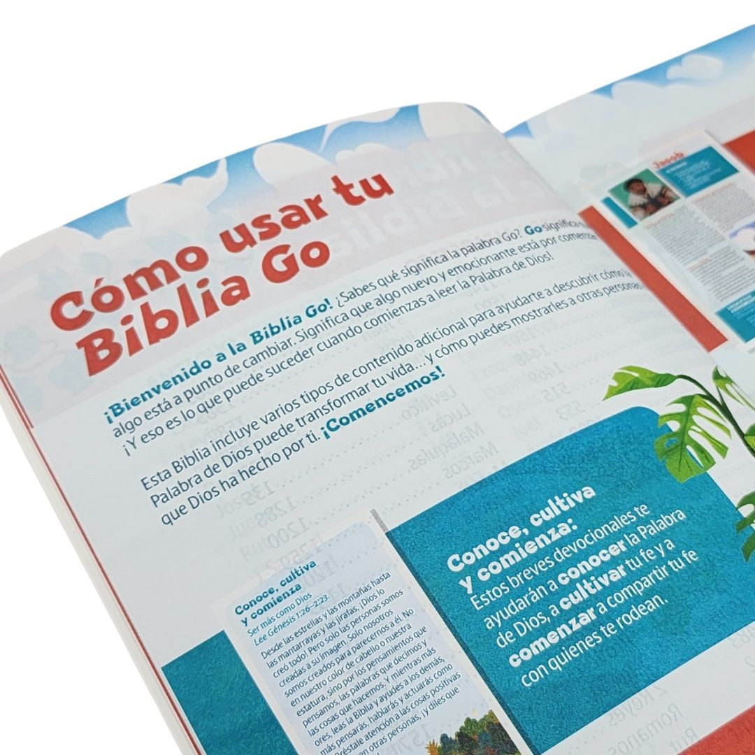 La Biblia GO está llena de contenido divertido y atractivo para ayudar a los niños a explorar la Palabra de Dios y a compartirla con los demás. Con el texto claro, preciso y fácil de leer de la Nueva Traducción Viviente, esta Biblia para niños planta la semilla de la fe y comparte el amor transformador de Dios con los pequeños a través de más de 600 características centradas en el tema de la transformación.